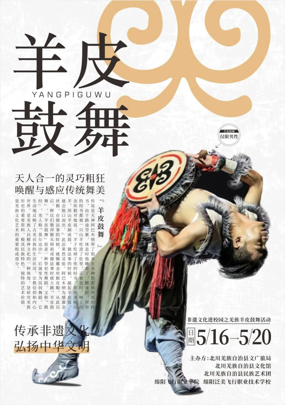 弘扬优秀传统文化,传承和?;け贝ǚ俏镏饰幕挪?,绵飞学子一直在行动。继羌绣非遗传承学习培训之后,近日,“古羌羊皮鼓舞”这一悠久神秘的非遗传承走进绵飞校园。