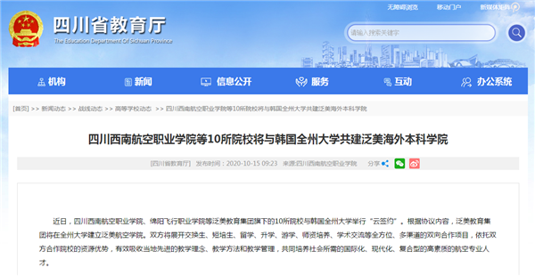 四川省教育厅官网:绵阳飞行职业学院等10所院校将与韩国全州大学共建泛美海外本科学院