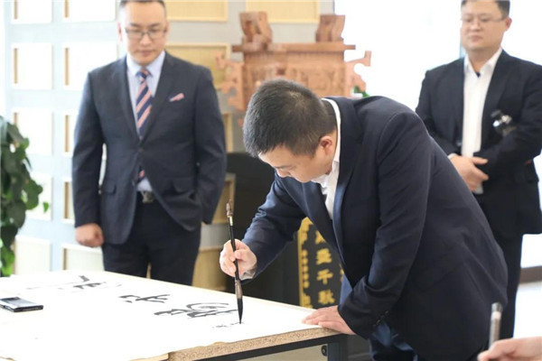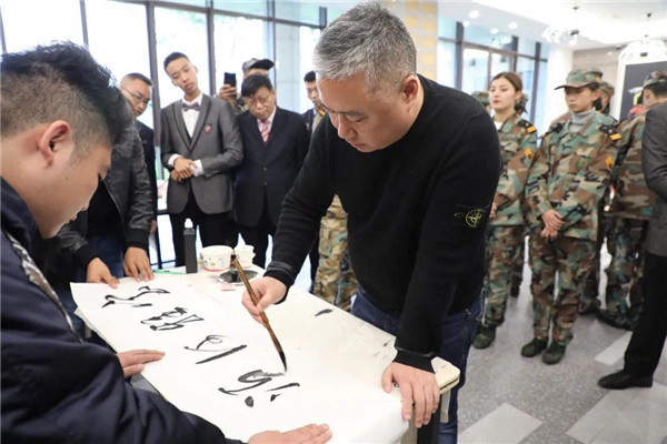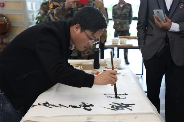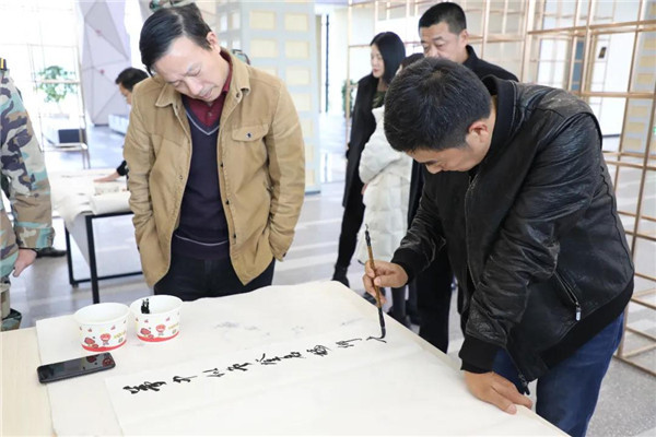 ?? 笔会期间,恰逢董事长魏全斌先生陪同省外嘉宾参观绵飞院。董事长魏全斌为参观嘉宾一一介绍书画作品,并亲自挥毫泼墨,书写楹联佳句。