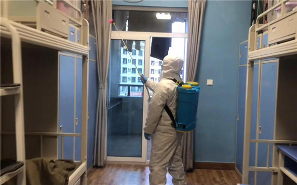 ????早上,飞越之家女生457宿舍晨检中突然发现1名学生有疑似感染新冠肺炎迹象,参谋长立即上报学校疫情防控办公室,经过校医测量体温初步研判、病况问询后,对其宿舍同学全部进行了隔离、汇报,随后学校疫情防控办公室联系北川县疾控中心,开始转运病人,进行环境消毒。