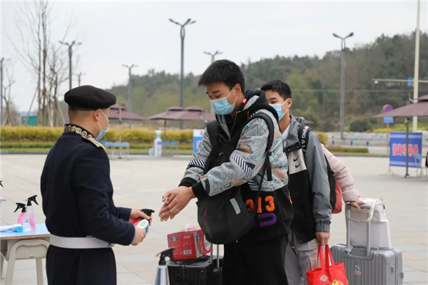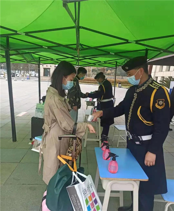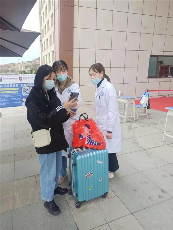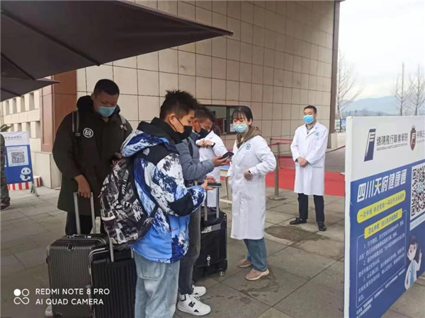 ??报到登记、体温检测、酒精消毒、四川天府健康通二维码扫码······一切井井有条。?