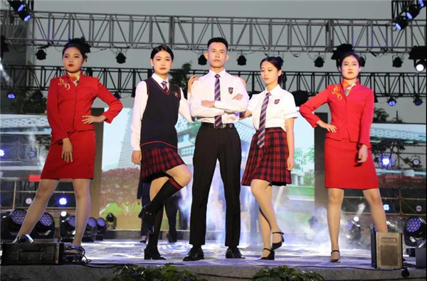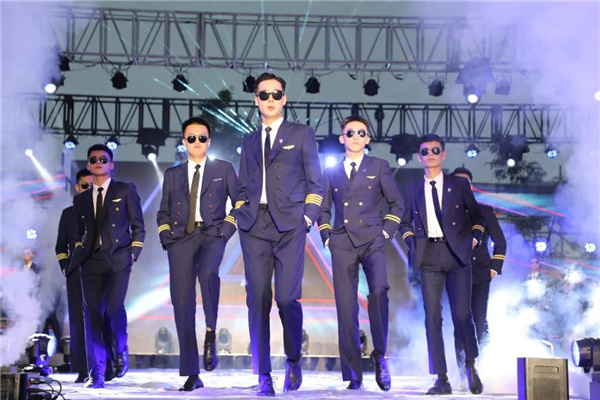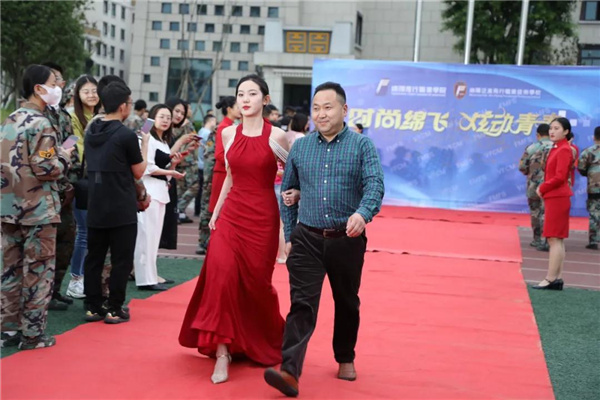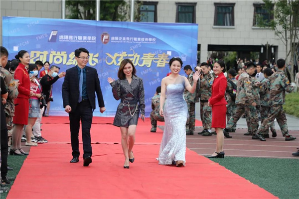 ????晚上18时30,2021五四礼仪时装秀T台前,长长的红毯贯穿整个操场。师生代表、飞行教员及嘉宾身着节日盛装,神采飞扬,结伴踏上节日红毯。霎时间,活动现场星光熠熠,欢声四起。