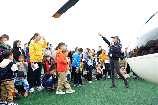 泛美通航飞行基地的女飞行教官黄雨阳为小朋友们讲解直升机飞行原理。