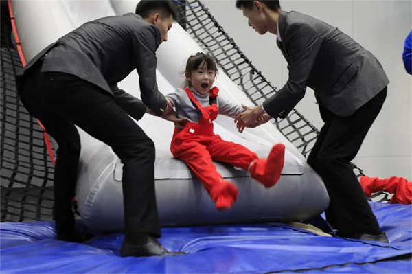 ????静舱逃生——在实训楼b737-800客舱撤离训练舱前,听绵飞校王涛老师讲解静舱逃生背景情况和防冲撞姿势。小营员们换上静电服,经过热身运动,一个个登舱勇敢尝试静舱逃生训练。
