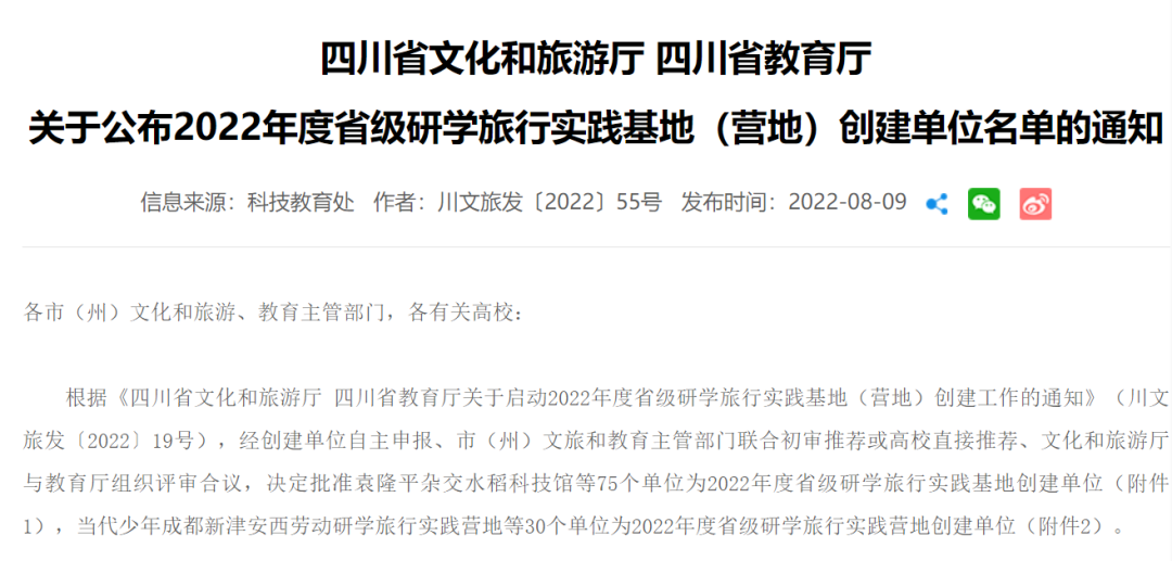 ????近日,四川省文化和旅游厅、四川省教育厅联合下发通知,公布了2022年度省级研学旅行实践基地(营地)创建单位名单,共75个基地、30个营地入选。绵阳飞行职业学院航空主题研学基地成功入选!