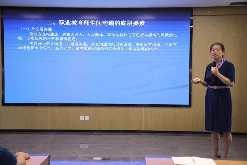 ????解继蓉教授以《教育始于沟通》为主题,围绕职业教育师生间沟通的底层要素、师生沟通的基本原则基本方法、职业教育课堂教学对沟通的意义等几个方面,深入浅出的阐述了如何做好职业教育师生之间的有效沟通。