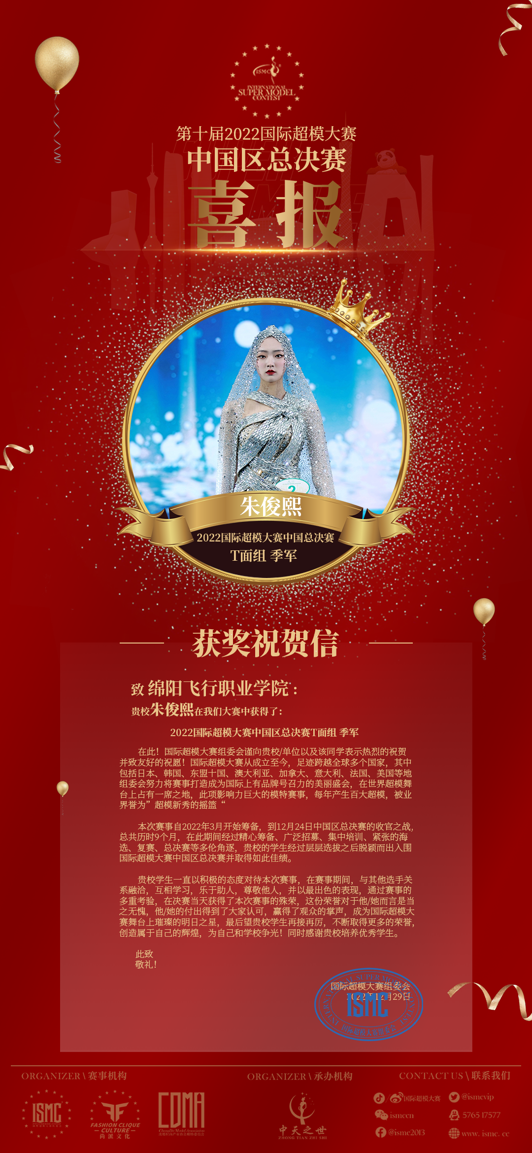 荣耀加冕!绵飞院学子朱俊熙荣获第十届国际超模大赛中国区季军!