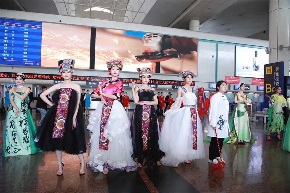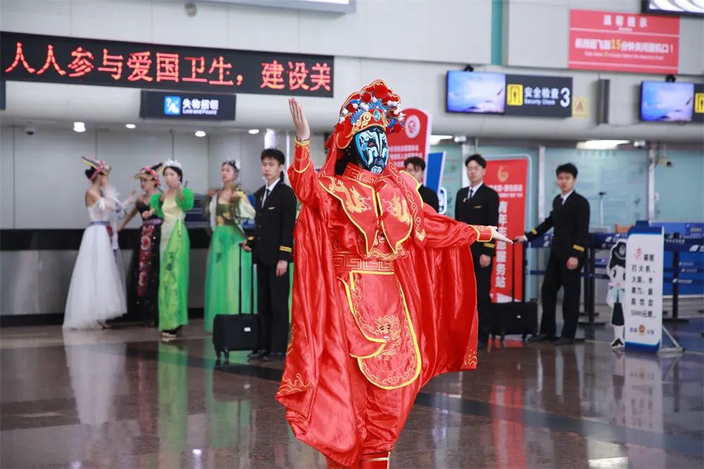 ????5月3日,在“五四”青年节来临之际,绵阳飞行职业学院、绵阳泛美飞行职业技术学校的学子们来到绵阳南郊机场进行了一场“跃动青春·致敬大运会”的时尚快闪活动,羌族华服秀、川剧变脸、青春劲舞相结合,绵飞学子的特色走秀向旅客们展现了传统文化和航空文化的魅力。