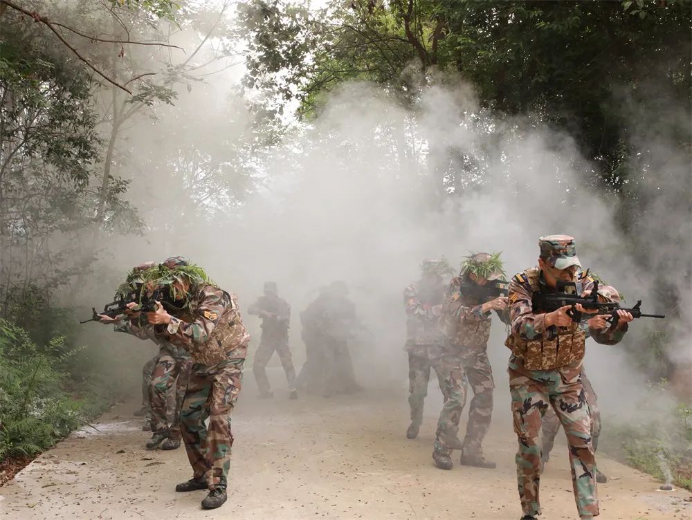 ????行军途中有“彩蛋”:模拟炮火封锁地带,侦查小分队穿越火线占领隘口要点,同学们做好防“毒气”、“毒烟”安全防护,急行突击。