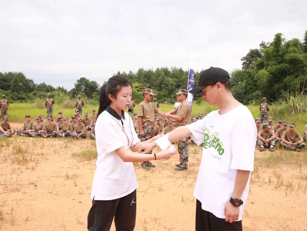 ????短暂休整,同学们环形席地而坐,为后面的行程养精蓄锐。战地救护培训组老师适时进行战地紧急救护培训,讲授止血包扎、环形包扎、螺旋包扎、螺旋反折包扎,踝关节扭伤固定包扎,四肢抽筋的处理方法等。
