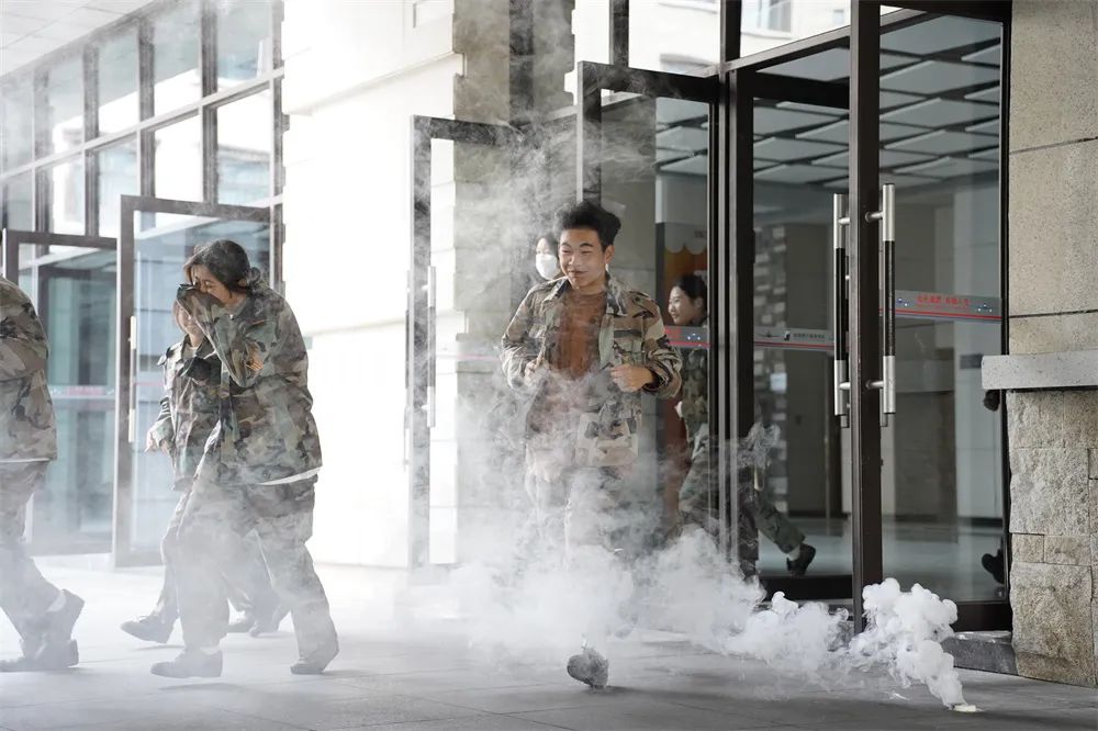 ????火灾警报拉响,龙堡教学楼仿真火灾点位突然浓烟弥漫,楼内各疏散口、楼梯口等重点区域的引导员迅速就位,师生们捂住口鼻、弯腰低姿态沿疏散标识所示方向有序完成疏散。