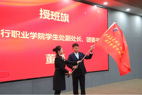 绵阳飞行职业学院学生处副处长、团委书记董晓为2023-2024学年“青马工程”培训班授班旗。
