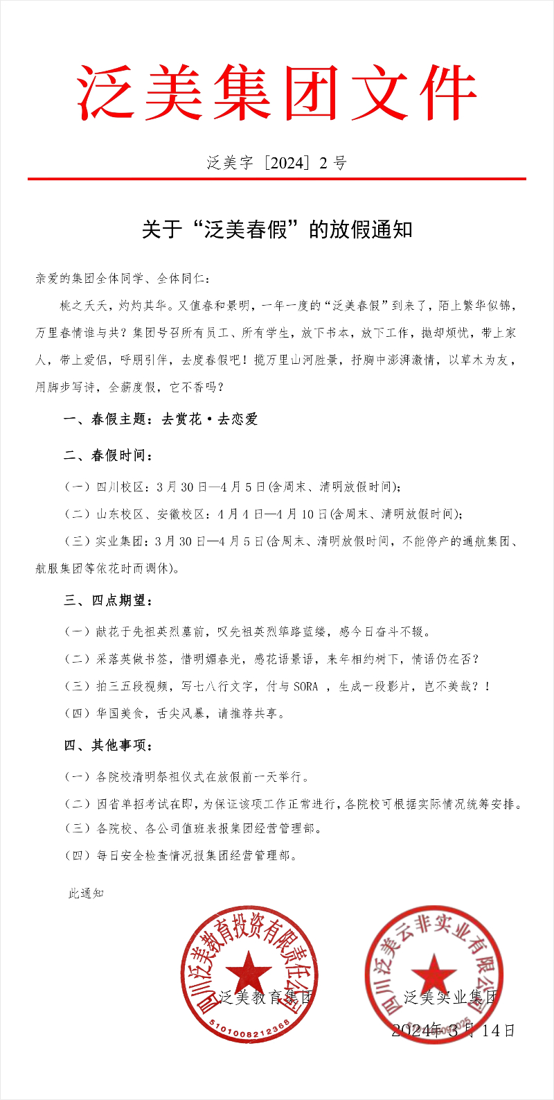 【通知】关于“泛美春假”的放假通知