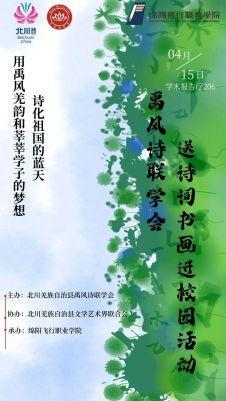禹风羌韵映蓝天,诗词书画润校园。4月15日,以“用禹风羌韵和莘莘学子的梦想诗化祖国的蓝天”为主题的“禹风诗联学会送诗词书画进校园活动”走进绵阳飞行职业学院。本次活动由北川羌族自治县禹风诗联学会主办、北川羌族自治县文学艺术界联合会协办、绵阳飞行职业学院承办。