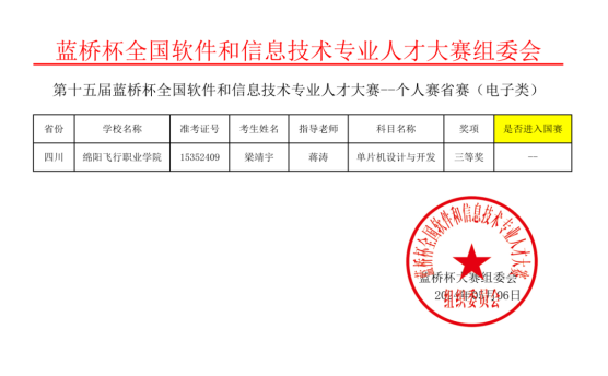 近日,备受瞩目的第十五届蓝桥杯全国软件和信息技术专业人才大赛(四川赛区)圆满落幕。经过激烈角逐,绵阳飞行职业学院应用电子技术专业学子梁靖宇在电子类赛项中斩获三等奖!