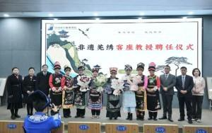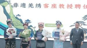 聘任仪式上,执行院长梁国辉为四位非遗羌绣传承人——张桂熙、陈云珍、杨华娟、杨红莉颁发聘书。