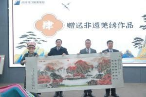 在赠送非遗作品环节,北川沙朗恰文化艺术发展有限公司董事长沈毅、总裁张桂熙向绵阳飞行职业学院赠送原创羌绣作品,梁国辉院长和李选华副院长代表学院接受了这份珍贵的礼物。这份礼物将在校园中绽放光彩,激励广大学子传承古老技艺、弘扬民族文化。