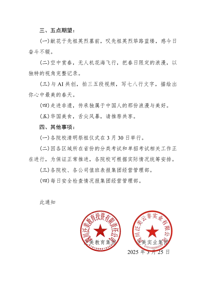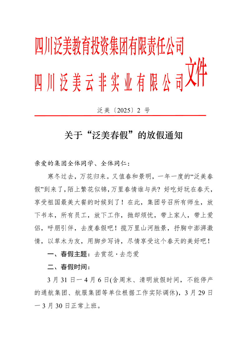 ??寒冬过去,万花归来。又值春和景明,一年一度的“泛美春假”到来了,陌上繁花似锦,万里春情谁与共? 好吃好玩在春天,享受祖国最美大餐的时候到了!在此,集团号召所有师生,放下书本,所有员工,放下工作,抛却烦忧,带上家人,带上爱侣,呼朋引伴,去度春假吧!揽万里山河胜景,抒胸中澎湃激情,以草木为友,用脚步写诗,尽情享受这个春天的美好吧!