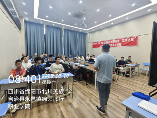 为认真贯彻北川羌族自治县人力资源和社会保障局关于东西部劳务协作工作部署,提升农村劳动力职业培训的针对性和实效性,绵阳飞行职业学院紧密围绕提升技能人才培养质量这一核心目标,大力弘扬精益求精、追求卓越的工匠精神,全方位展示学院在职业教育领域的办学成果与鲜明特色。学院于 2025 年 7 月 7 日至 7 月 23 日,举办了北川羌族自治县东西部协作“蓝鹰之星”无人机驾驶员初级培训班。