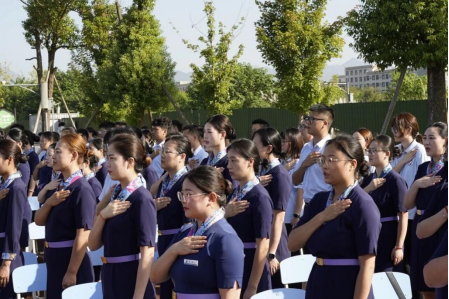 国歌嘹亮,国旗飘扬。在庄严的升旗仪式中,开学典礼正式拉开帷幕。全体师生肃立,齐唱国歌,面向国旗行注目礼。