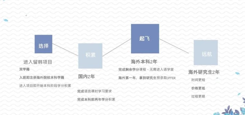 ????完成本科学分课程,TOPIK考试准备,通过泛美集团与韩国名校联合审定“校内考试”,办理相关出国手续,准备海外留学;