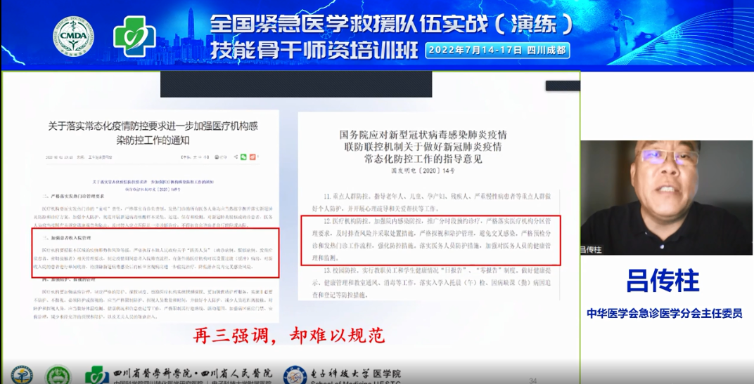 ????在四川省卫健委领导指导下,培训班以“提升应急思维,夯实急救技能,提升处置能力”为共同目标,邀请多位行业专家、教授进行了精彩的理论授课。他们以我国首批建设的国家(四川)紧急医学救援队十年的建设经验为例,详尽介绍了灾害救援、队伍建设、批量伤员处置、后勤保障等相关方面。