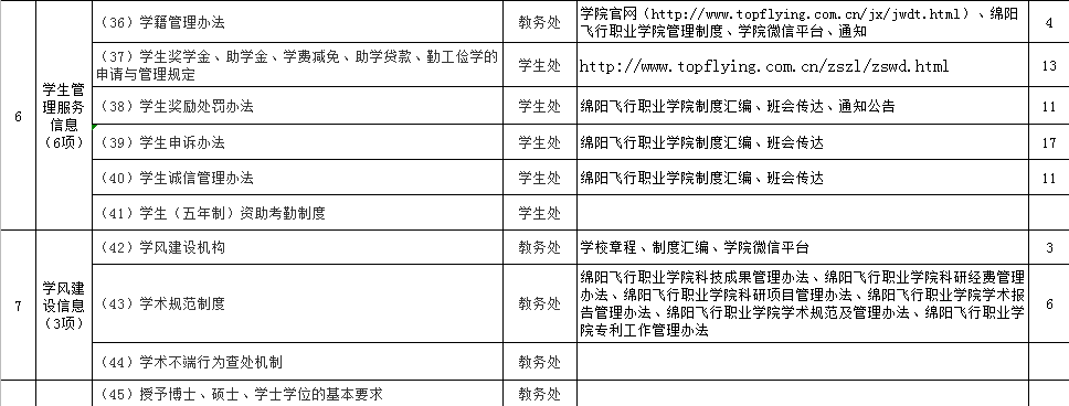 ????绵阳飞行职业学院设立后,按照教育部和四川省教育厅关于信息公开的相关规定要求,持续规范公开内容,丰富公开方式,强化督查指导,增强公开实效,推动学校信息公开工作健康发展。