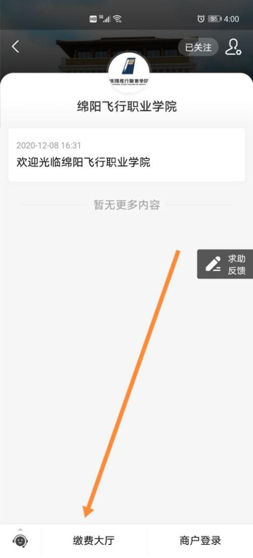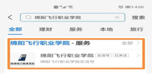 1.打开支付宝,搜索“绵阳飞行职业学院”,选择点击关注“绵阳飞行职业学院公众号”。