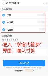 3.在界面指定位置输入身份证号和姓名,点“确定”进入缴费界面,选择缴费项目,享受国家免费政策退役军人选择“代管费”;自费生选择“学费”和“代管费”,点击确认付款,完成缴费。