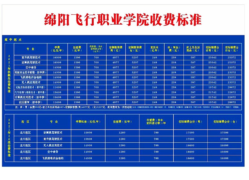 绵阳飞行职业学院2021年秋新生、2021年20级收费标准公示