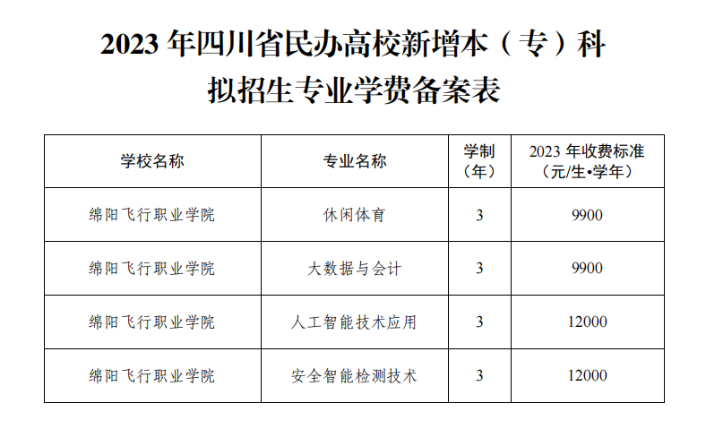 绵阳飞行职业学院2023年新增专业收费标准公示
