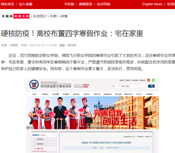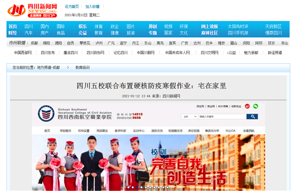 ????近日,泛美教育集团旗下的绵阳飞行职业学院、绵阳泛美飞行职业技术学校、四川西南航空职业学院、四川西南航空专修学院、成都航空旅游职业学校等这五所院校联合布置四字寒假作业:宅在家里。要求所有同学在寒假期间不要外出,严格遵守防疫相关规定,积极配合和支持防疫要求,?;ぷ约汉图胰说慕】蛋踩M?,“宅在家里”也并不意味着同学们无所事事,而是以“宅在家里”为前提,学习、锻炼身体等,过一个既有意义又安全的寒假。网友称,这个寒假作业意义重大,坚决执行,贯彻到底。?