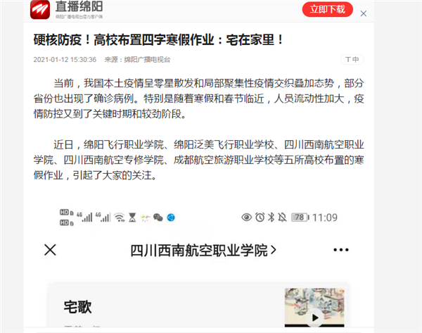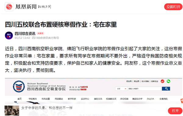 ????中新网、中国网、凤凰新闻网、中国社会新闻网、四川新闻网、绵阳广播电视台客户端“直播绵阳”、北川融媒体中心等纷纷给予关注和报道。各路媒体在报道中指出:随着寒假和春节临近,人员流动性加大,疫情防控又到了关键时期和较劲阶段。在这种严峻的形势下,四川这五所学校联合布置“宅在家里”这份作业,是非常值得推广的,非常有必要运用好这种正确的“防疫姿势”,同时呼吁全国所有的学生朋友们记得宅在家里,共同为防疫贡献一份力。