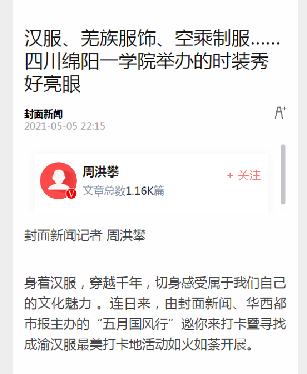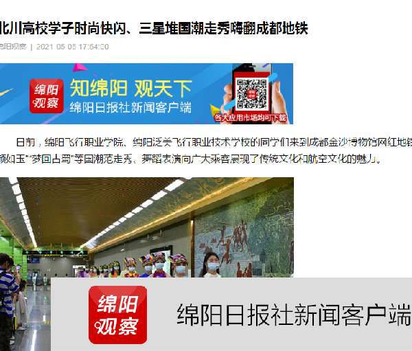 ????5月3日,在2021年“五四”青年节来临之际,绵阳飞行职业学院、绵阳泛美飞行职业技术学校的同学们来到成都金沙博物馆网红地铁站进行了一场“致敬五四”的时尚快闪活动,通过“神秘三星堆”、“国风颜如玉”、“梦回古蜀”等国潮范儿走秀、舞蹈等表演向广大乘客展现了传统文化和航空文化的魅力。?中国网、中国社会新闻网、四川新闻网、四川在线、封面新闻、香港商报-地方频道、绵阳日报、科教新观察、北川融媒体中心等纷纷给予关注和报道。