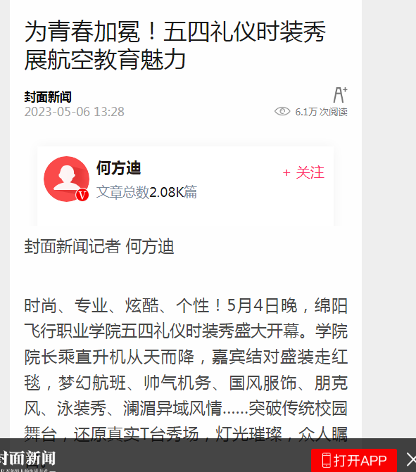 ????5月4日晚19时,绵飞五四礼仪时装秀盛大开幕。院长乘直升机出席,嘉宾结对盛装走红毯,梦幻航班,帅气机务,国风服饰,朋克风、泳装秀、澜湄异域风情……突破传统校园舞台,还原真实T台秀场,灯光璀璨,众人瞩目,在绵飞五四礼仪时装秀的舞台上,每一个场景都是一帧璀璨夺目的海报。不遗余力筑造光彩大舞台,让莘莘学子释放天性展示技能和才华,为热爱加冕。各大媒体纷纷聚焦绵飞五四之夜——