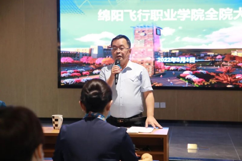 ????8月1日,绵阳飞行职业学院举行全体教职工会议。学院党委书记资建民宣讲省委工作会议内容,深入学习贯彻习近平总书记来川视察重要指示精神,总结上半年工作,安排部署下半年工作,进一步动员全体教职工振奋精神、坚定信心,以更加奋发有为的精神状态抓好下半年各项工作,以实际行动迎接党的二十大胜利召开。