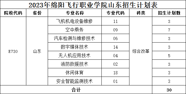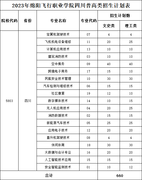 ????2023年,绵阳飞行职业学院统招计划为2580名。其中,省外统招计划1420名,省内统招计划1160名(普高660名,中职500名)。
