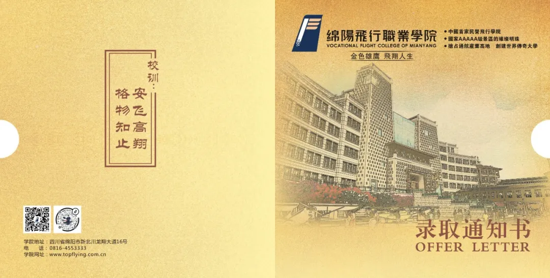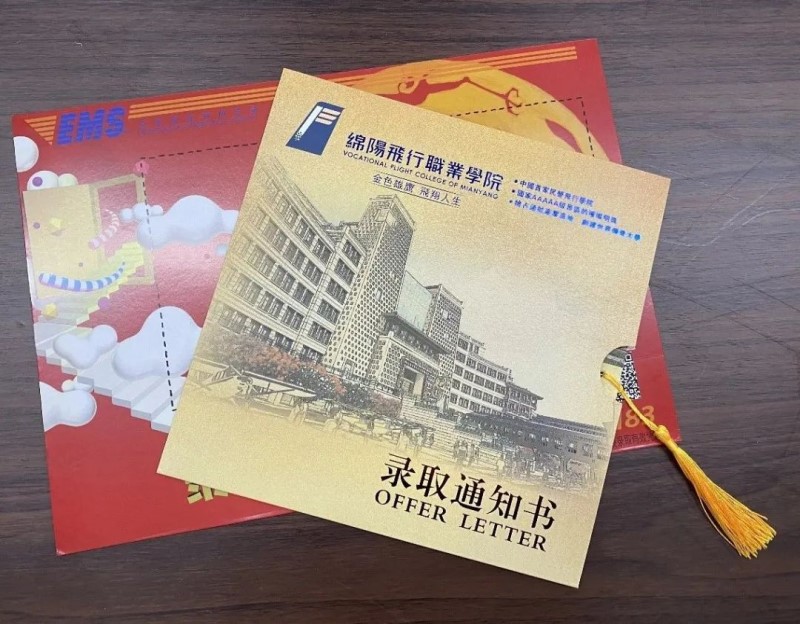 ????绵阳飞行职业学院录取通知书由金色封套和录取通知书内页组成,表达了“志在蓝天”的建校理想,具有绵阳飞行学院独有的特色,给人强烈的视觉冲击,且带着扑面而来的历史厚重感。