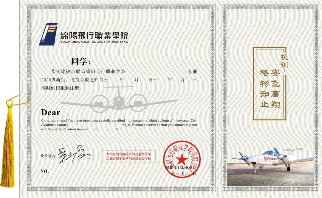 ????录取通知书内页主页为中英文的录取通知具体内容和院长签名,副页为校训和派珀飞机PA-44双发教练机,象征着对顺利录取的绵飞学子表达最真挚的祝福与最殷切的期望,祝愿天之骄子们在飞行学院学习中奋发向上,翱翔蓝天、搏击长空,书写人生的新篇章!