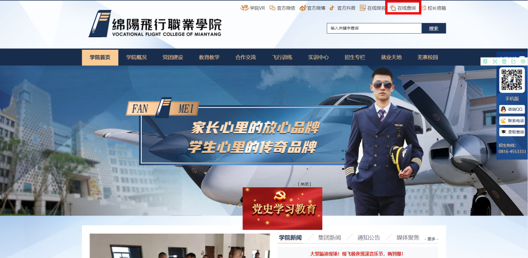 1.搜索绵阳飞行职业学院官网(http://m.a4i1.cn/),点击右上方在线查询;