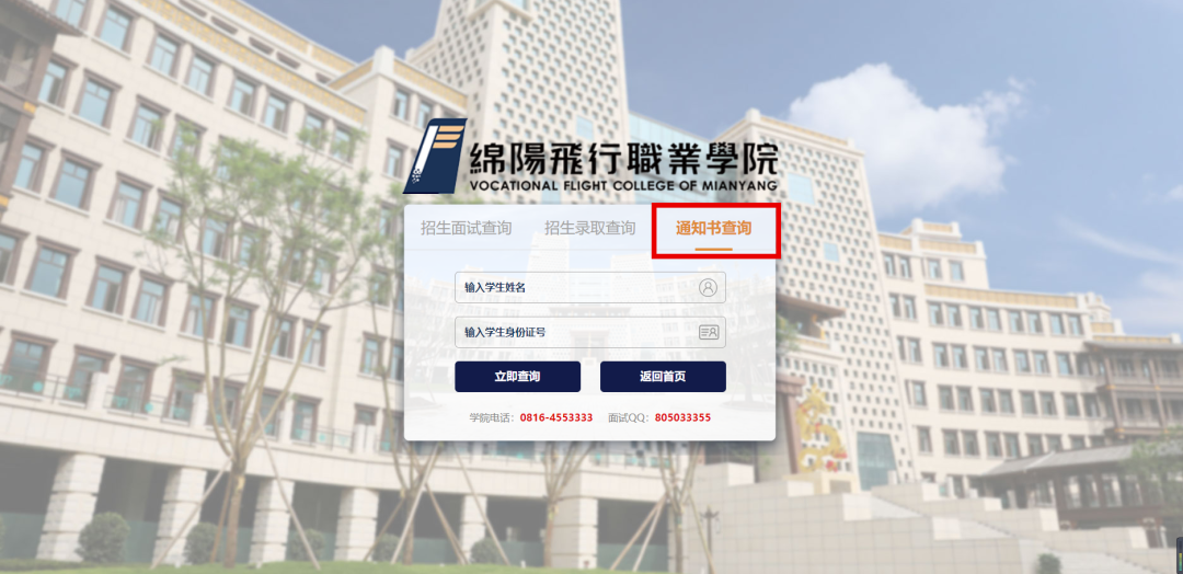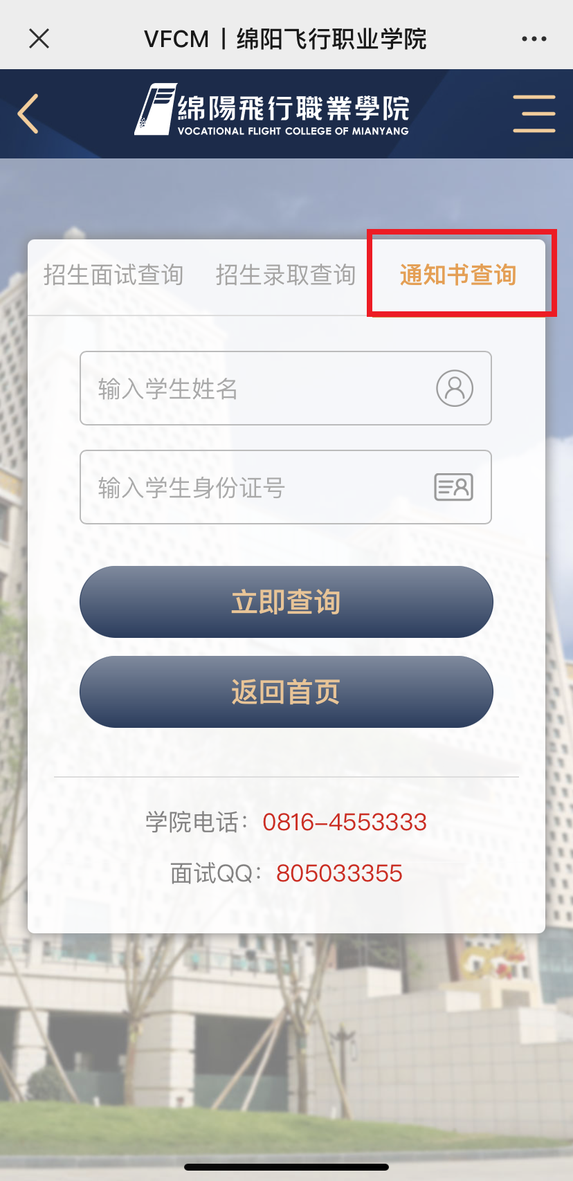 2.进入后点击通知书查询,根据提示填写学生姓名和身份证号码;