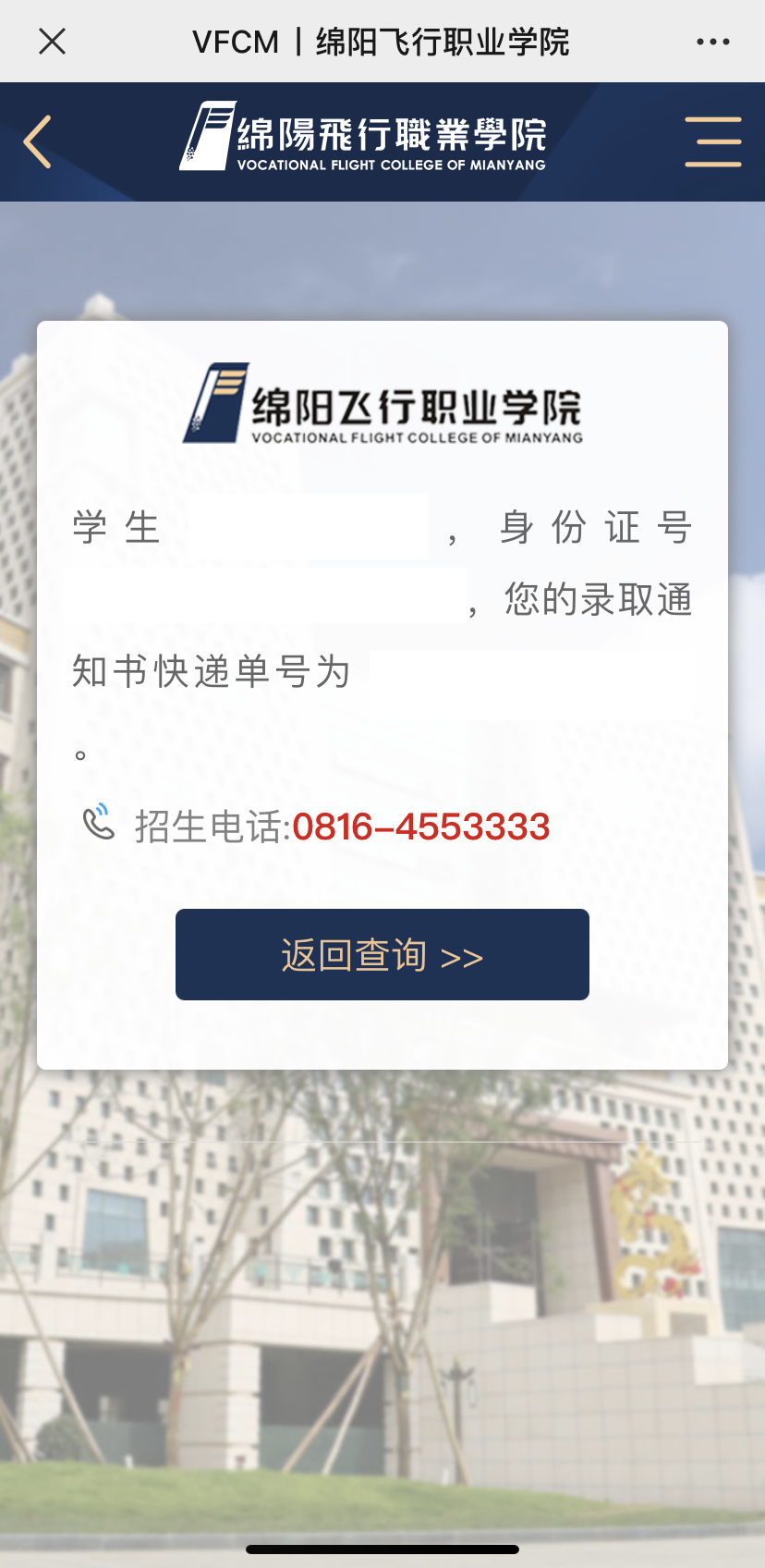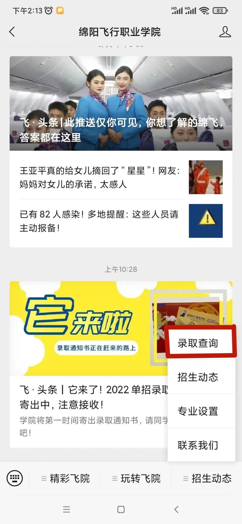 1.搜索微信公众号打开“绵阳飞行职业学院”,点击右下角“招生动态”,进入录取查询;
