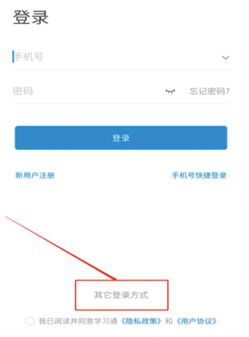 1.打开APP,在登录界面下方点击“其他登录方式”,若已登录, 则退出当前账号;
