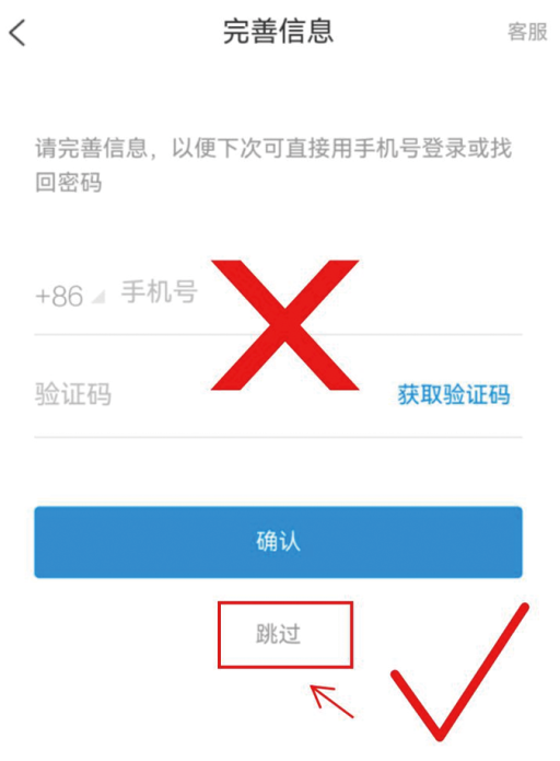 3.在新弹出的完善信息界面一定要点“跳过”, 以完成登录;
