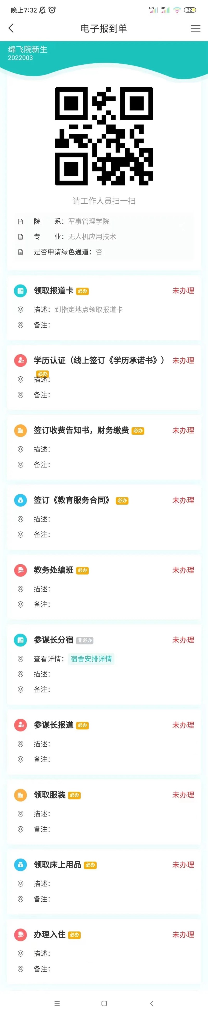 3.新生将二维码出示给各工作点位工作人员,然后根据报道单上的流程内容办理即可。