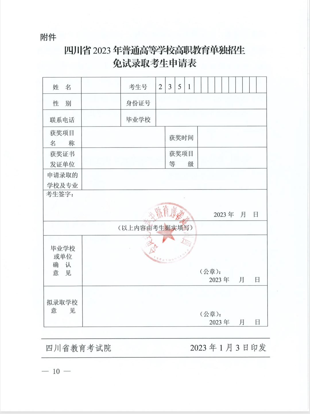 ????获得由教育部主办或联办的全国职业院校技能大赛三等奖及以上奖项或由省级教育行政部门主办或联办的省级职业院校技能大赛一等奖的中等职业学校应届毕业生,和具有高级工或技师资格(或相当职业资格)、获得县级劳动模范先进个人称号的在职在岗中等职业学校毕业生,经教育厅核实资格、高等职业学校考核公示,并在省教育考试院官网公示后,可由有关高等职业院校免试录取。所有符合免试录取条件的考生应参加高职单招报名,并在2023年3月25日前向学校提交《四川省2023年普通高等学校高职教育单独招生免试录取考生申请表》(见附件)。高校是免试资格审核的主体,要严格认真审核考生免试材料的真实性和有效性。在正式办理免试录取手续前,申请免试的考生应正常参加报考院校的高职单招考试。