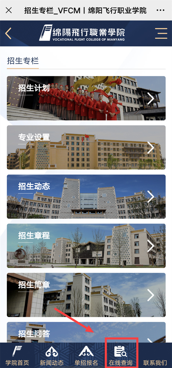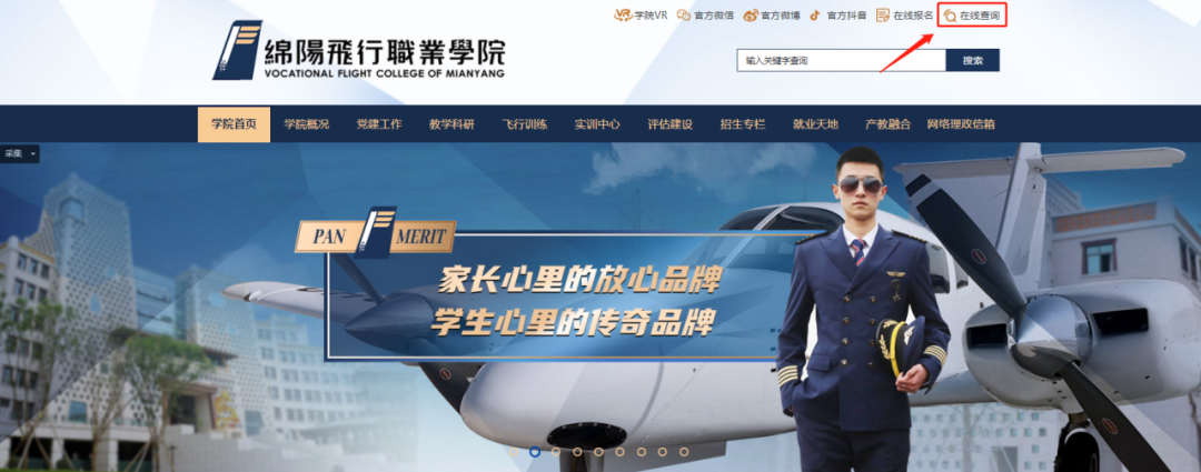 ????1、打开绵阳飞行职业学院官网:http://m.a4i1.cn/(也可点击文末“阅读原文”跳转),找到右上角“在线查询”;