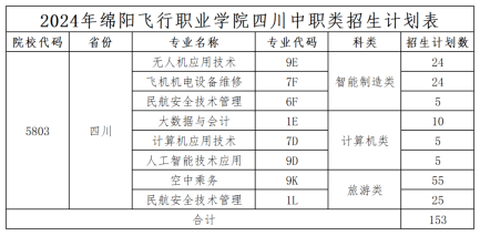 2024绵飞院省内统招招生计划出炉