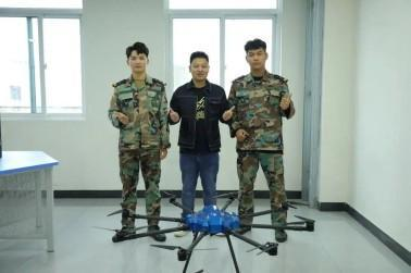 ▌范庆洲(左)、陈聪(右)与泛美智飞指导老师,实习期间,范庆洲做无人机架线工作一个月收入9000,陈聪做无人机植保工作半个月收入8000