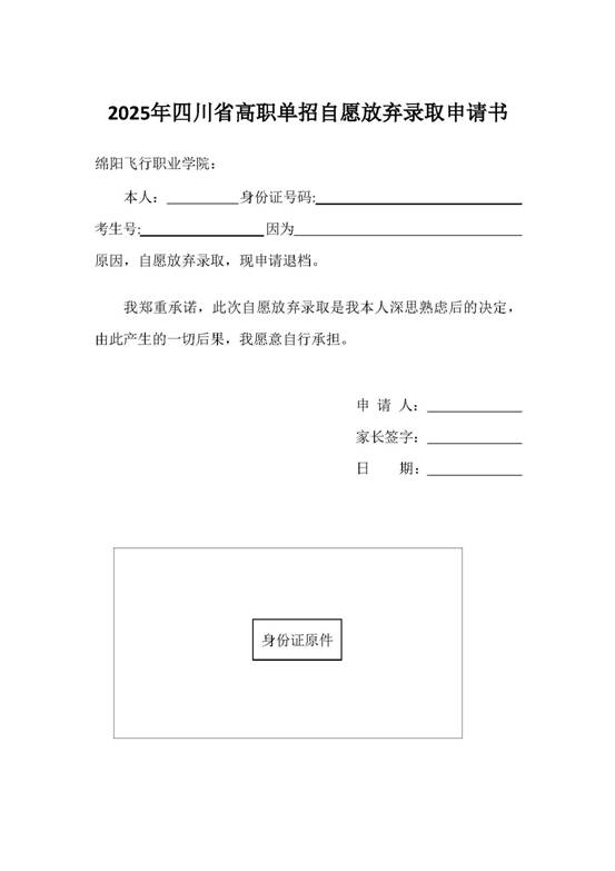 二、投档到我院的考生可以在2025年4月13日12:00前申请放弃录取资格。拟申请放弃录取资格的考生请考生本人手写放弃录取申请书,由家长和考生本人签字并按本人手印,以图片形式发送至学院招生处区域负责老师处或邮箱(991128439@qq.com),逾期不再接受放弃录取申请。